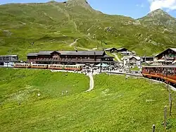 Kleine Scheidegg is a railway station and hub[2] that is situated on the summit of Kleine Scheidegg, a mountain pass in the Bernese Oberland region of Switzerland. The pass, located between the Lauberhorn and the Eiger's ridge, houses a complex of hotels and railway buildings. Administratively, the station is in the municipality of Lauterbrunnen in the canton of Bern, a few metres from the border with the municipality of Grindelwald.[3][4]