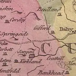 Blaeu's map of 1654, dating from Timothy Pont's survey of circa 1604, clearly shows the loch and erroneously indicates that its outflow entered the sea near Montfode. A dwelling named 'Iargan' is recorded and a 'Knokawart'.[12] Herman Moll's map of 1745 marks, but does not name the loch.[13] Roy's map of 1747 shows and names 'Loch Jargen', situated without an inflow burn.[14] Armstrong's map of 1775 does not show the loch, but Knock Jargon fort is clearly marked. William Aiton's map of 1811 shows a loch at Jargon, however, the outflow runs in entirely the wrong direction.[15] Thomson's map of 1832 marks and records Loch Jargon.[16]