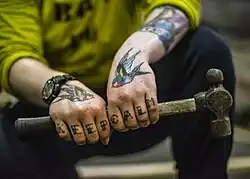 A knuckle tattoo is a kind of tattoo on the tops of a person's fingers, between the knuckles, commonly two groups of four-letter words or one eight-letter word.[1] It is not necessarily a prison tattoo, as sometimes believed, but remains an unpopular form of tattoo—alongside hand tattoos in general—due to the difficulty of hiding it in situations such as a formal setting where it would be seen as crass.[2] Some people also use their knuckles to tattoo drawings and images, sometimes in groups of four, such as the four symbols of a deck of playing cards.[3]