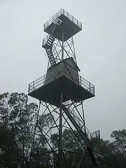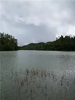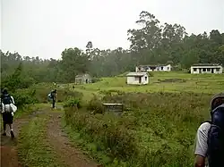 Just past this junction is a Forest Department checkpost, which controls entry into the Allinagaram Reserve forest through which the road passes west to Berijam Lake and beyond. This area is part of the proposed Palani Hills Wildlife Sanctuary and National Park. Beyond km marker 13 on the Berijam road there is a firewatching tower from where one may have a fine view of the secluded Berijam Lake and the surrounding forest.[1] At km 21 at 2,180 meters (7,150 ft) elevation, Berijam has a Forest Department Camp including an Eco-Education Center for visitors. Nature areas to be visited here include: swamp ecosystem, fresh water ecosystem, nature trail, bridge, medicinal demonstration garden, museum, nature walk, grassland and shola. This camp also is the site of an old two-story brick building, partly damaged and blackened over the years, with a bright yellow painted name reading "Britisher's Transit Camp". This is one of several transit camps built during World War II for British soldiers to rest along the 230 km (143 mi) British "Escape Route" from Kodaikanal via Top Station and Munnar to Cochin. While most of the transit camps are now either dilapidated or demolished, the one at Berijam is still used as a Forest Rest house.[11] At this point an old road, now just a trail, forks off to the north for 12 km (7.5 mi) down to Kavunji village at 1,975 metres (6,480 ft) elevation.