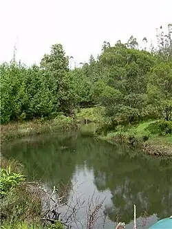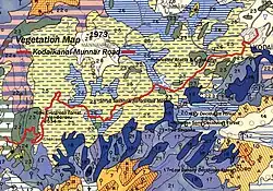 From 1948 through the 1960s the Tamil Nadu Forest Department planted large areas of indigenous grasslands along the road with black wattle for producing tanning agents for use in the leather industry.[30] blue gum (eucalyptus) and Mexican weeping pine were planted in order to provide a reliable alternative firewood supply to protect the native shola forests from cutting for firewood. The 1973 vegetation map shows these imported tree species already taking over the grasslands around the road.[31] A detailed dynamic map of 2002 vegetation shows distribution of various plantation species that have replaced most of the grasslands and native evergreen forests.[32] Another 2002 map of Palni Hills, showing distribution of wattle plantations, also shows wattle dominating the route of the Kodaikanal Munnar Road.[33] Exotic forests now cover over 80% of the area which was previously covered by Grasslands.[34] These non-native species now dominate thousands of acres once dominated by native grasses.[35]