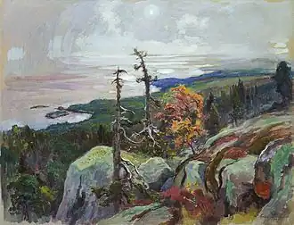Koli has inspired many painters and composers, such as Jean Sibelius, Juhani Aho and Eero Järnefelt.[3] Järnefelt painted a large landscape scene with A.W. Finch and Ilmari Aalto in 1911. This painting can be seen in the Helsinki railway station restaurant. Painters discovered Koli in the 19th century, and it has been called one of the best natural scenes in Finland.