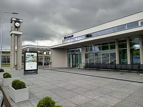 In 2025, the old building of railway station between the platforms was demolished and the passenger waiting room was moved to a smaller building outside the platforms on the edge of the station. The investment in the construction of the new building railway station cost PLN 13 million.[1][2]