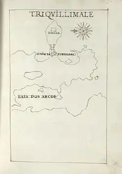 A rich collection of local texts written since the fourteenth century record the traditions pertaining to the shrine, including Konamamalai temple's use of the alternate name "Maccakeswaram".[71] A temple of a thousand columns, during this medieval period, Koneswaram attracted pilgrims from around the Coylot Wanees Country and across Asia, culminating in it becoming the richest and most visited place of worship in the world of any faith. The last rites during the funeral of King Bhuvanekabahu VII of Kotte, a Hindu monarch who signed all of his official proclamations in Tamil were conducted at Koneswaram in 1551. His closest religious official and most trusted ambassador was of Hindu faith. Historian Diogo do Couto described the Pagode of Triquinimale as a principle temple of its kingdom while Portuguese Catholic priest and author Fernão de Quieroz described it as the "Rome of the Hindus of the Orient more frequented by pilgrims than Rameshwaram, Tirumalai-Tirupati, Kilvelur, Kanchipuram, Jagannath in Odisha or Vaijayanti in Bengal." Furthermore, he described the splendor of the famous temple of Tenavarai at its zenith as similar in its greatness on the island to Koneswaram and how idolatrous navigators would descry Koneswaram from the sea.[28] In a 1613 written letter by Jesuit fray Manuel Barradas, Koneswaram is described as a "... massive structure, a singular work of art. It is of great height, constructed with wonderful skill in blackish granite, on a rock projecting into the sea, and occupies a large space on the summit."[79] King Ethirimana Cinkam had resisted a call by D. Hieronymo de Azevedo the previous year to aid the latter in building a fortress in Trincomalee. The enterprise was abandoned.[80] With the defeat of King Cankili II, all of the territory of the kingdom of Jaffna, comprising Trincomalee and Batticaloa, was assigned to the "spiritual cures of the Franciscans." This decision was taken by the bishop of Cochin, fray Dom Sebastião de S. Pedro.[81] By the end of 1619, a small Danish fleet had arrived at Trincomalee; in May 1620, the Danes occupied Koneswaram temple and began works for the fortification of the peninsula before being defeated.[82]