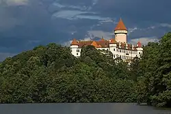 Konopiště Castle (Czech pronunciation: [ˈkonopɪʃtjɛ]; Czech: zámek Konopiště, German: Schloss Konopischt) is a four-winged, three-storey castle located in Konopiště, now a part of the town of Benešov in Central Bohemian Region, Czech Republic. It has become famous as the last residence of Archduke Franz Ferdinand of Austria, heir to the Austro-Hungarian throne, whose assassination in Sarajevo triggered World War I. The bullet that killed him, fired by Gavrilo Princip, is now an exhibit at the castle's remote museum.