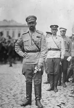 On 19 September, the Makhnovshchina concluded an agreement with the Ukrainian People's Republic, which allowed a brief period of respite for the two forces.[24] At this time, the Kontrrazvedka began infiltrating the Ukrainian People's Army (UPA) and reported that the nationalists had begun negotiations with the White movement at Khrystynivka.[20] They also reported on an apparent nationalist attempt to remove Makhno and merge the two armies, which allegedly included Fedir Shchus and Halyna Kuzmenko.[25] These developments culminated with the Kontrrazvedka plotting the assassination of the nationalist leader Symon Petliura, which they planned to carry out at an arranged meeting with him in Uman.[24] But Petliura managed to avoid his would-be assassins, who were surrounded and killed after a two-hour battle with the UPA, forcing both sides to withdraw.[26] Some Ukrainian nationalists responded by defecting to the Makhnovists, who were integrated into the Free Cossack Insurgent Group following their investigation by the Kontrrazvedka, which continued surveilling their commanders and even executed some for having committing pogroms after joining.[27]