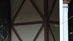The original building, of four rooms with a central corridor, has a corrugated iron gable roof with skillion roof verandahs to all sides, and timber perimeter stumps with concrete stumps internally. Verandahs have unlined ceilings, chamfered timber posts, timber brackets and capitals, a timber handrail with central support, and retains some of the original beech timber floor boards. Walls have single-skin vertical boarding with external cross-bracing, and gable ends have weatherboard cladding and timber finials. The building is entered via central front steps and a panelled cedar front door with glass sidelights and fanlight. The rear verandah has been enclosed and provides access to the rear wing, but retains verandah fittings and features a similar central door, sidelight and fanlight assembly to the front. Each room has a two cedar sash windows to the verandahs.[1]