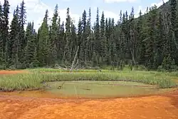 The Paint Pots are an acidic, cold water, mineral spring system from which ochre is deposited at spring outlets. The minerals are principally iron oxide which produces the water and mud's reddish colour but other similar minerals can also be present and vary the colours to include various shades of yellow, red and brown. The acidic, metal-rich water has limited capacity to support living species, but at least 14 species of algae, one liverwort and one moss species, as well as some extremophilic bacteria, have been identified living in those waters. The ochre was collected by the Ktunaxa people for use as pigments and the iron oxide was commercially mined for use in paint manufacturing for nearly two decades until the park was established in 1920.[7]