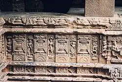 In Karnataka their most famous temples are the Kashivishvanatha[16] temple and the Jain Narayana temple at Pattadakal, both of which are UNESCO World Heritage sites.[17] Other well known temples are the Parameshwara temple at Konnur, Brahmadeva temple at Savadi, the Settavva, Kontigudi II, Jadaragudi and Ambigeragudi temples at Aihole, Mallikarjuna temple at Ron, Andhakeshwara temple at Huli, Someshwara temple at Sogal, Jain temples at Lokapura, Navalinga Temple at Kuknur, Kumaraswamy temple at Sandur, at Shirival in Gulbarga and the Trikunteshwara temple at Gadag which was later expanded by Kalyani Chalukyas. Archeological study of these temples show some have the stellar (multigonal) plan later to be used profusely by the Hoysalas of Belur and Halebidu.[18] One of the richest traditions in Indian architecture took shape in the Deccan during this time and one writer calls it Karnata dravida style as opposed to traditional Dravida style.[19]