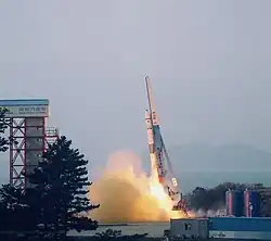 KSLV-1 launched on August 25, 2009. It was originally a cluster of indigenous liquid KSR-III rockets with a solid propellant to form a multistage launcher. However, KARI experienced more difficulties than expected in SLV development, because it required much stronger propellant power than KSR-III possessed to launch a satellite into orbit.[19] After several failed attempts, KARI turned to Russia's Khrunichev Design Bureau for assistance in developing a liquid-propellant rocket engine for the KSLV-1 as well as for cooperation in the construction of the launch facility at the Naro Space Center. The first stage of the launcher was derived from the Russian URM-1 (Universal Rocket Module) developed by Khrunichev. The second stage of the launcher was a solid Kick Motor developed by Korea, which included the Inertial Navigation System; the power, control, and flight safety systems; plus the nose fairing.[19] South Korea launched its next rocket, the KSLV-2 in 2021. The first stage of KSLV-II has 4 clustered engines, each of which has a 75 metric ton thrust. All three stages use indigenously developed rocket engines.