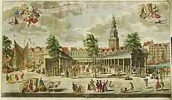 In 1768, the exchange was rebuilt in brick. The building remained standing until it was demolished in 1884, one year after the section of the Damrak between Papenbrugsteeg and Oude Brug was filled in. [6][7]