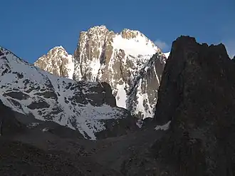 Korona Peak (Russian: пик Корона, romanizedPik Korona, lit.'Crown Peak') is a mountain in the Kyrgyz Ala-Too Range of the Tian Shan. It is located in Ala Archa National Park in Kyrgyzstan.[1] It is named for its crown-like appearance.
