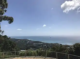Korora Lookout has views over the Korora Basin and out to the sea. The lookout is accessed from Sealy Lookout Drive by the 400m Gumgali walking track.[16] Along this track are sculptures, murals and signage illustrating the Aboriginal story of Gumgali, the black goanna.