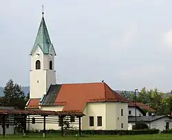 There are two church buildings in Koseze. The older structure, originally dedicated to Saint Margaret, is one of the oldest churches in the immediate Ljubljana area[9] and dates back at least to the 14th century[1][10] and the exterior has frescoes dating to the first half of the 15th century.[9] A bell tower was added to the church in 1708, and the building was badly damaged in the 1895 Ljubljana earthquake.[10] The church was repaired between 1907 and 1908.[1][10] Ljubljana–Koseze became a parish in 1961, when it was separated from the Parish of Šentvid, and the church was rechristened as Divine Savior Church.[11] The interior of the church was renovated by the architect Anton Bitenc (1920–1977) circa 1973.[9] The medieval church was too small to serve the needs of the parish, and so a larger church was built next to it from 1972 to 1974.[12] Dedicated to the Virgin Mary, this was the first church built in Ljubljana after the Second World War.[13] The new church was designed by Anton Bitenc[4][12][14] with extensive stained glass by Stane Kregar (1905–1973).[14]