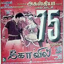 Kovil (transl. Temple) is a 2004 Indian Tamil-language romantic drama film written and directed by Hari and produced by A. M. Rathnam. It stars Silambarasan and Sonia Agarwal while Vadivelu, Rajkiran, Charle and Nassar play supporting roles. The music was composed by Harris Jayaraj, with editing done by V. T. Vijayan and cinematography by Priyan. The film was released on 10 January 2004 and became a box office hit.[1]