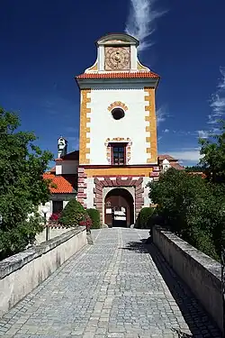 The small Chapel of Our Lady in the southwest corner of the château gardens was built between 1584 and 1589.[2] The glory days of the château ended when Peter Vok of Rosenberg had to sell it to Emperor Rudolf II in 1601 because of debts.[2] The emperor gave the château to the Eggenberg family and in 1719 it was acquired by the Schwarzenberg family.[2] The international arrangement of the building to the layout of an Italian villa, with the open loggia on the ground floor being replaced here by a large vaulted entrance hall, which corresponded to the area of the Great Hall on the first floor, is linked to the ground floor by a staircase. On both floors rooms of varying sizes are liked to these chambers.