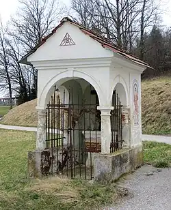 At the base of the hill below the village, at the intersection with the main road to Ig, is an open chapel-shrine. It dates from the 19th century.[5]