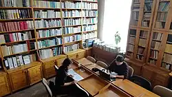 The library was established first with publications from inheritances, and then, through various purchases, donations and book exchanges.[1] The library moved to its current location in 1994, where in addition to more than 10,000 books, the latest scientific periodicals are available. The volumes contain mainly the basic works of Hungarian and universal ethnography, but they also include works of social science (anthropology, sociology, history, linguistics, local history, literature). The bequests of renowned Transylvanian ethnographers (Károly Kós Jr., Jenő Nagy, Judit Szentimrei, Olga Nagy, József Faragó etc.) make up a very valuable part of the library. The books can be read in the two reading rooms available. The accessible stock is constantly expanding through contacts with institutions and publishers in the Carpathian Basin, and the results of scientific literature and researches are constantly enriching the library.[2][13] Since 2007 the library catalog is available on the Society's website, where the most important information about the items (author, editor, title, publisher, place of publication) can be searched.[14]