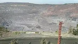The presence of iron ore in the regions around Kryvyi Rih has been known since at least 1781 and was rumoured before;[1] being known to the ancients.[2] Throughout the 1800s the region was investigated for its mineral wealth. Iron ore of 70% iron content and manganese ores were found. In 1881 the industrial extraction of iron ore from the near region began, alongside other developments such as the construction of the Kryvyi Rih railway. By 1884 over 100,000 tons of iron ore had been extracted, and the railway though Kryvyi Rih (the Yekateryninska railway), 477 versts (505,6 km) long, from Yasynuvata station via Kryvyi Rih to Dolynska station had been opened.[1] The production expanded rapidly in the next years, as it did in other industrialized regions and countries. By 1896 there were 20 mines producing over 1,000,000 tonnes of ore in the Kryvyi Rih Basin, and the population had exploded though the toll on the health of the working men had begun to be noticed.[1] Industrial expansion continued in the region up to 1917. Production dropped during the first world war due to lack of labour.[1]