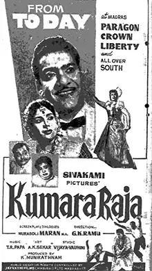 Kumara Raja (transl. Prince) is a 1961 Indian Tamil-language film directed by G. K. Ramu. The film stars J. P. Chandrababu, T. S. Balaiah and M. N. Rajam.[2] It was released on 21 April 1961.[3]