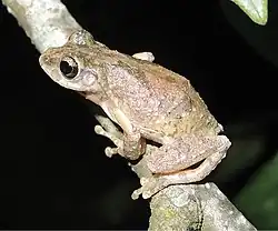 Adult males measure 25–29 mm (1.0–1.1 in) in snout–vent length. Females are unknown. The snout is obtusely pointed without prominence on its tip. The tympanum and sypratympanic fold are distinct. The finger and toe tips bear discs with circum-marginal and transverse ventral grooves. The fingers have basal webbing whereas the toes moderately webbed. The dorsal and lateral surfaces are coarse with small, and irregular tubercles. The dorsum is grayish brown with dark brown saddle-shaped mark; in some individuals, the mark can be X-shaped or even absent. There is a dark-brown inverted triangle-shaped mark between eyes. The head and the tympanic region are laterally brown with dark brown spot below the canthus. A broad dark brown bar runs along the canthus rostralis. The limbs are dorsally brown with clear dark brown barring and otherwise light to faint yellow with scattered brown spots. The chest and abdomen are white and nearly immaculate, or in some individuals, scattered with fine brown spots. The chin is clouded with black. The iris is golden brown.[2]