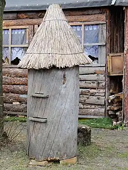 Agricultural tasks commenced in autumn with double plowing for sowing rye and winter wheat or harrowing to prepare the soil for spring sowing. In spring, the fields were fertilized with manure, silt, or peat mixed with animal dung. Subsequent plowing and harrowing were conducted before sowing, followed by additional harrowing to cover the seeds. The main harvest focused on rye, supplemented by smaller harvests of wheat, millet, oats, buckwheat, and barley. Harvesting was often a community effort, with neighbors assisting one another. The cut grain was gathered by hand using sickles, tied into bundles with straw, and left to dry before being stacked in small piles for later transport to the barn.[37] Traditional celebrations, such as dożynki, and symbolic customs were upheld. Until World War II, grain was threshed with flails on the barn floor. Later, horse-powered devices were used to operate threshers and winnowers, eventually replaced by electric machines. After threshing, chaff was separated and added to fodder for cattle and pigs. The cleaned grain was stored in carved wooden bins, woven straw containers, and later in cloth sacks.[37]