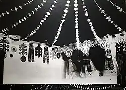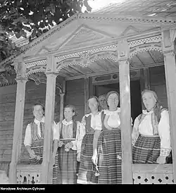 Since the early 20th century, postcards featuring elements of material culture (such as traditional outfits and paper cuttings) or views of Puszcza Biała and the architecture of nearby towns were published, increasing social awareness of the existence of Kurpie Białe.[79] The popularization of the folk culture of Kurpie Białe was also supported by exhibitions, many of which were organized in Pułtusk, such as in 1929[80][81][82][83][84] and 1949.[85]