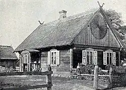 By the first quarter of the 20th century, all buildings were constructed only of wood using timber-frame construction, mainly used for residential buildings, or with a post-and-plank method. Houses were built according to one of three types characteristic of Puszcza Biała.[32] The first type was an asymmetrical wide-front building with an entrance on the side of the longer wall, built in a rectangular shape. Originally, these houses were single-room with a hall. Later, an additional room was added, which over time became a small chamber. Such houses were typical for small-scale farmers. The second type of house was a wide-front building with four rooms (a main room, a small chamber, a pantry, and a hall). This type developed from the first form under the influence of Kurpie settlement from Puszcza Zielona. In the interwar period, a third type of wide-front cottage appeared, which was constructed in the style of old serf houses. In this two-tract house, divided lengthwise by a hall into two parts on either side of the symmetry axis, two rooms were built. The entrance was from the road through an ornate porch to the hall and into the subsequent rooms, while the yard was accessed through the hall from the other side. After World War I, houses began to be built with cement blocks, which differed from traditional Kurpie construction. Life was centered in the most important room, the main room, which served residential, economic, social, and cultural functions, supported by its division into areas corresponding to these functions.[32][33]