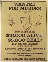 At first, Caine tried to flee to Tibet but was unsuccessful. He then escaped to the American Old West and in the first-season episode "Dark Angel" discovered from his grandfather Henry Caine (Dean Jagger) that he had a half-brother named Daniel. While he searched for Danny, he was on the run from a steady stream of bounty hunters and Chinese agents, some of whom were also Shaolin priests like himself, searching for him. In the pilot episode when another priest arrived to take him into custody, telling Caine that he had been searching for him for many weeks and that it had long been known he had fled to the US, Caine said to him, "For money? A Shaolin monk does not sell himself for a handful of rice." The monk's reply was, "You are more than a handful of rice" (the price placed on Caine's head by the Imperial government being $10,000 alive, $5,000 dead). Caine's hanfu was seen as gold with a red belt and the symbol of an open hand on the back (indicating that he is a master of all five forms), while his opponent was black with a maroon belt and the symbol of a snake on the back. In the ensuing fight, Caine killed the monk.