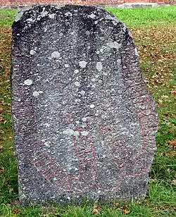 The runic text indicates that the stone was a memorial raised by members of a mercantile guild in memory of one of their members named Þorkell. U 379 is one of four runestones that mention guilds in Viking Age Sweden, the others being U 391 in Prästgatan, Ög 64 in Bjälbo, and Ög MÖLM1960;230 in Törnevalla.[1][2] These stones and others which discuss félags are evidence of the trading activities during this period of Scandinavian history,[1] and U 379 evidence of Sigtuna being a center of trade. Both U 379 and U 391 refer to a Frisian guild. Although merchants from Frisia dominated trade in northwest Europe from about 725 to 830, it is not believed that these two runestones indicate that the guild consisted of ethnic Frisians since the runic text is in Old Norse and the names (except for possibly one on U 391) are Scandinavian.[3] It has been suggested that the word frisa in the late Viking Age had come to denote any person who was a merchant, and that Frisian guild on these runestones simply meant a mercantile guild.[3]