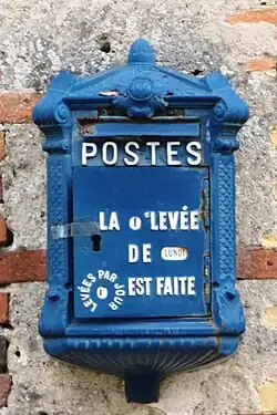 When Mougeot took office most letter boxes were of wood reinforced with iron, and dated to 1830. On 31 July 1899 Mougeot signed a decree to place a new type of cast-iron letter box into general usage, made by Delachanal of Paris. Nicknamed "mougeottes", they had three small windows that let the users see the day, the planned number of pick-ups and the last pick-up that had been made.[4] Two variants were made, one wall-mounted and the other on an iron column fixed to the sidewalk. The "mougeottes" were introduced experimentally at first, but proved very popular and were soon installed throughout France. At first bronze-green in color, from 1905 they were painted blue.[4]
