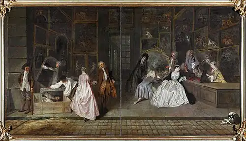 L'Enseigne de Gersaint (transl. "The Shop Sign of Gersaint") is an oil on canvas painting in the Charlottenburg Palace in Berlin, by French painter Jean-Antoine Watteau. Completed during 1720–21,[1] it is considered to be the last prominent work of Watteau, who died some time after. It was painted as a shop sign for the marchand-mercier, or art dealer, Edme François Gersaint.[2] According to Daniel Roche the sign functioned more as an advertisement for the artist than the dealer.[3]