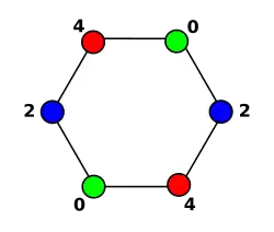 An L(2,1)-coloring is a proper coloring, since adjacent vertices are assigned distinct colors. However, rather than counting the number of distinct colors used in an L(2,1)-coloring, research has centered on the L(2,1)-labeling number, the smallest integer such that a given graph has an L(2,1)-coloring using color numbers from 0 to . The L(2,1)-coloring problem was introduced in 1992 by Jerrold Griggs and Roger Yeh, motivated by channel allocation schemes for radio communication. They proved that for cycles, such as the 6-cycle shown, the L(2,1)-labeling number is four, and that for graphs of degree it is at most .[2]