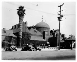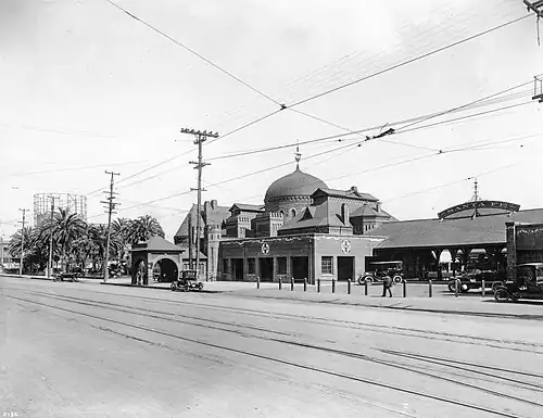 Santa Fe opened La Grande Station on July 29, 1893.[2][3] The station was unique for Southern California with its Moorish-inspired architecture.[4] Los Angeles Railway Yellow Cars called at the street adjacent to the station by 1920,[5] and was at different times served by the N, 7, and 9 lines.[6][7][8]