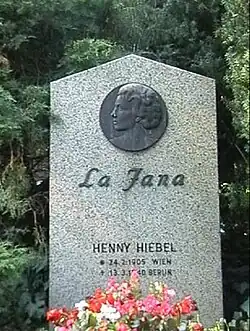 La Jana was buried in Waldfriedhof Dahlem. The grave site had been cleared,[24] but on 25 September 1990, the City of Berlin declared it an honorary grave[25] and it is now marked by a simple stone with a bas relief plaque of her in profile. The stone had been kept at the Heimatmuseum in Steglitz.