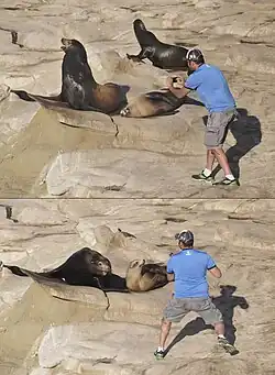 Primarily as a result of their nationwide protection following the Marine Mammal Protection Act (MMPA) in 1972, California sea lion populations quickly rebounded.[13] The Channel Islands population has greatly expanded and inhabit parts of central and southern California. As the sea lions have occupied more of La Jolla Cove, their interactions with people and property have increased significantly, with both positive and negative outcomes.[14] Large wildlife in urban spaces raises concerns about public health and the safety of people and wildlife in close proximity to each other.[14] These circumstances pose challenging management efforts for the City of San Diego as it seeks to protect the ecological integrity of the area while also ensuring opportunities for public use of the beaches.[15][16]