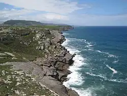 The borders between Marina and Montaña are usually fixed geographically in the Sierra del Escudo de Cabuérniga, a mountain range that cuts the Cantabrian valleys, generally perpendicular to the sea, and from which the Cantabrian mountain range abandons the steep relief for a much gentler one, which descends in steps to the coast without exceeding, with some exceptions, 200 m above sea level.[4] These lands emerged from the sea during the Quaternary era and were progressively eroded from their fractures, so that the current depressions are coincident with fault lines. Several of them are today the beds of the great rivers of the region, such as the Besaya and the Asón, as well as shaping the bay of Santander and other coastal areas. At the same time, plate tectonics caused the slight uplift of some areas. Examples of the unevenness of erosion are La Masera, a hill located next to the San Martín de la Arena estuary, and Mount Vispieres. The dolomitic and limestone areas withstood the climate better. Its heights are generically called Sierras Litorales, which includes the mountain ranges of Udías-Novales, Camargo, Peña Cabarga, Monte Buciero and Cerredo.[5]
