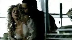 The music video was premiered on 26 April 2005 through MTV's Making the Video series.[19] Following a special airing of Daddy Yankee's "Gasolina" video on MTV in 2004, "La Tortura" was among the first Spanish music videos to air on MTV.[3] It also became the first Spanish video to be added to high rotation on VH1.[67] Additionally, the whole episode of Making the Video was aired in Spanish, with English subtitles.[3] The music video begins with Sanz observing Shakira in an apartment as she is walking down the street on her way to her own apartment, which is located on the other side of the street, while holding a bag of onions. He watches her crying while cutting them, but the onions are out of his view. Scenes from the time they were still a couple are shown, with the pair seen eating Chinese food, and Shakira crawling across the table as Sanz admires her. She is then seen dancing erotically on a building's roof, covered in black greasepaint. The video ends with Shakira coming to the window to realize Sanz was spying on her and turns back.