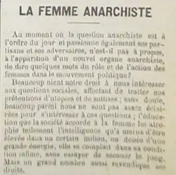 Tardif observes that Leloup highlights how "the role of women remains limited due to gender prejudices that exclude them from politics", and also that women are less educated than men, which places them in a situation of intellectual inferiority.[4] However, Leloup doesn't resign herself to this situation and argues that several anarchists are demanding their rights and a place within the movement.[4] From the author's perspective, the "anarchist woman" is presented as "an activist who engages alongside men in the revolutionary struggle while seeking to improve her own social situation".[4]
