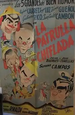 La Patrulla chiflada is a 1952 Argentine adventure comedy film of the classical era of Argentine cinema that is set in Africa,[1] directed by Carlos Rinaldi and featuring the Los Cinco Grandes del Buen Humor (Five Greats of Good Humor) group of comic actors.[2] It stars Rafael Carret, Jorge Luz, Zelmar Gueñol, Guillermo Rico and Juan Carlos Cambón.[3]