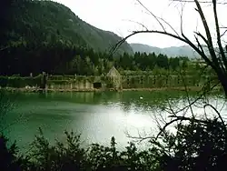 The lac de Sylans fills part of the Nantua water gap, which was formed during the last glacial era. The formation of the lake itself is much more recent; it is the result of the collapse of the cliff on the Northern side of the valley a few centuries ago.[1] This huge landslide partially blocked the valley between the ice factory and the source of the Doye, above les Neyrolles, blocking the river that was flowing along what is now the bed of the lake, causing the lake to form. Today the water percolates through the landslide debris to form the source of the Doye.[2]