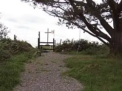 During the Irish Rebellion of 1798, rebels were in complete control of County Wexford for the three weeks between 30 May and 21 June. These leaders were a mixture of Catholic and Anglican farmers, merchants and professional men, but also included several Catholic priests, most of whom appear to have been renegades in the eyes of their bishop even before joining the rebels.[4] The military effort was conducted with the help of an informal conscription of able-bodied men and order was preserved in towns by volunteer tradesmen and in the countryside by small crossroads guarding parties. Lacken Hill was used as a camp for the rebels in the aftermath of one of the most bloody battles of the entire rebellion, the Battle of New Ross.[4] It is estimated that perhaps as many as two thousand rebels were killed. The rebels camped on Lacken Hill from 11 June. Their numbers dwindled greatly during this time down to approximately 400 by 19 June, when Father Philip Roche led the remaining able-bodied insurgents in a retreat to the Three Rocks near Wexford town to avoid British troops.[5] Today there is a Holy Cross and commemorative stone at the top of the hill, with a plaque commemorating the actions of the rebels who fought in the uprising, died on Lacken Hill and were buried in unmarked graves there.