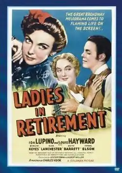Ladies in Retirement is a 1941 American film noir directed by Charles Vidor and starring Ida Lupino, Louis Hayward and Evelyn Keyes. It was produced and distributed by Columbia Pictures. Lupino and Hayward were married at the time. It is based on a play of the same title by Reginald Denham and Edward Percy, produced in London in 1939 and New York in 1940.[1][2]