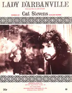 "Lady D'Arbanville" is a song written and recorded by Cat Stevens and released in April 1970. It subsequently appeared on his third album, Mona Bone Jakon, released later that year. It was his first single released after signing a contract with Island Records, with the encouragement of his new producer, Paul Samwell-Smith, fostering a folk rock direction. "Lady D'Arbanville" has a madrigal sound, and was written about Stevens' former girlfriend, Patti D'Arbanville, metaphorically laying her to rest.