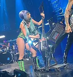 Gaga worked with Nicola Formichetti on selecting the various outfits for the residency.[20] For the Enigma show, the main inspiration was sci-fi,[21] and the list of designers included Tom Ford, Asher Levine, and Vex Latex.[22] Gaga's first look is a bejeweled, silver catsuit with built-in heeled boots, along with a black headpiece.[20][22][23] The outfit was covered in tiny mirrors, with Out magazine's Glenn Garner noting that "given her nightlife roots, it's fitting that she's channeling a disco ball at the beginning of her show".[20] Gaga then changed into a BDSM-inspired leather corset with neon green details. It was completed with a black PVC jacket with her initials written on the back side of it, featuring feathers in the same fluorescent green.[20][22][23] A later look was an armor-inspired suit with light-up panels,[20][22] which received comparison to a Patricia Field costume "for a movie about a late '80s heavy metal singer".[20] Gaga also appeared in a transparent purple dress, with a metallic purple cut-out bodysuit underneath.[20][22][23] For the finale, she was wearing a champagne-hued gold latex bodysuit with a collar which created the illusion of wings.[23][24] Out's Garner compared it to outfits from The Fifth Element and ones worn by David Bowie.[20] Removing the outfit revealed a second-skin like, nude-colored unitard.[20][25]