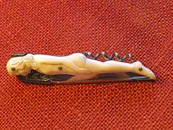 An early twentieth-century laguiole knife with a corkscrew, the carved ivory handle in the form of a nude woman