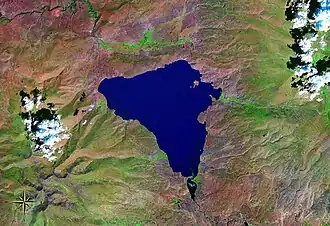 Lake Çıldır (Turkish: Çıldır Gölü; Georgian: ჩრდილი, ჩრდილის ტბა, Črdilis tba, meaning "lake of shadows", Armenian: Ծովակ Հիւսիսոյ, Tsovak Hyusiso, meaning "small sea of the north", Armenian: Պաղկացի լիճ, Paghkatsi lich, meaning "cold lake"), is a large freshwater lake in the provinces of Ardahan and Kars in northeastern Turkey. It is located close to the borders with Georgia and Armenia. Lake Çıldır is located at an elevation of approximately 1,959 m (6,427 ft) and is surrounded by a mountainous region. It has an area of 123 km2 (47 sq mi) and a maximum depth of about 42 m (138 ft). Water from the lake is used for irrigation.[1] The lake freezes over in the winter.