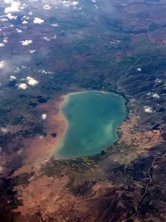 The lake is situated in the Palas neighborhood of Sarıoğlan district in Kayseri province. It is 60 km (37 mi) away from the city of Kayseri. The lake is at the center of a closed basin.[1] Its elevation is 1,054 m (3,458 ft) above mean sea level. The surface area is 25–35 km2 (9.7–13.5 sq mi). It is fed by five creeks. During the dry season, the lake basin is covered by a 10 cm (4 in) layer of salt. The lake is the site of a salt works.[2][3]