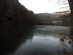 Starting from the 1970s, the extraction of porphyry exerted significant anthropogenic pressure on the lake (in addition to the provincial road 71, which flanks it on the eastern shore); the waste from quarry processing (one of which, later closed, was located right next to the northern shore) ended up in the lake, either carried by rain or by human action (some discharge pumps were seized by the Comando carabinieri per la tutela ambientale e la transizione ecologica in 2009.[7]); as a result, the lake underwent severe degradation, to the point that in the early 2000s it was considered almost devoid of life forms;[3][4][8] subsequently, a restoration and requalification project was initiated,[9] and, by 2020, fishing is possible in the lake[5]