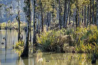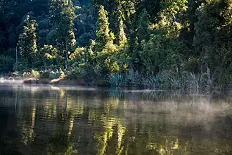 The ecology of Lake Wahapo was severely affected by the avulsion of the Waitangitāhuna River in 1967.[20] The river carries large amounts of fragmented schist rock and debris from a massive slip in the headwaters of the river's catchment. The river's new course after the avulsion was across an ancient alluvial fan and through a stand of kahikatea (Dacrycarpus dacrydioides) at the northeastern end of the lake. Heavier fractions of the debris are deposited before reaching the lake, but the lighter elements are carried to the lake. Silt was quickly deposited in the kahikatea forest, burying the low understory vegetation and causing widespread mortality of the trees at the head of the lake. Within three or four years, the dying trees were subject to fungal attack and could not be salvaged for timber.[3] In areas where less silt was deposited (less than about 60 centimetres (2.0 ft) deep), only a few trees died, and those that survived produced adventitious roots, allowing them to adjust to the saturated silt.[10] Tōtara (Podocarpus totara), miro (Prumnopitys ferruginea), mountain horopito (Pseudowintera colorata), patē (Schefflera digitata), and mikimiki (Coprosma rotundifolia) also survived by producing adventitious roots. Mosses, herbs and smaller shrubs were completely destroyed where there was initial silt deposition, but have recovered in areas where deposition has ceased.[10]